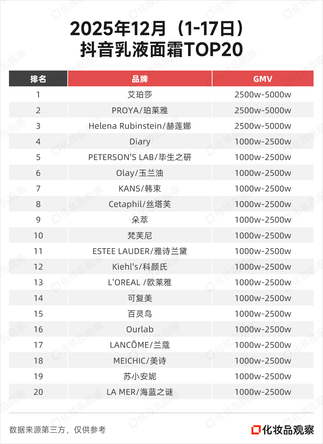 第三方数据显示,12月至今(12月1日-17日),抖音乳液面霜TOP1被艾珀莎拿下,GMV2500w-5000w,连珀莱雅、赫莲娜,也只能屈居2、3名。
