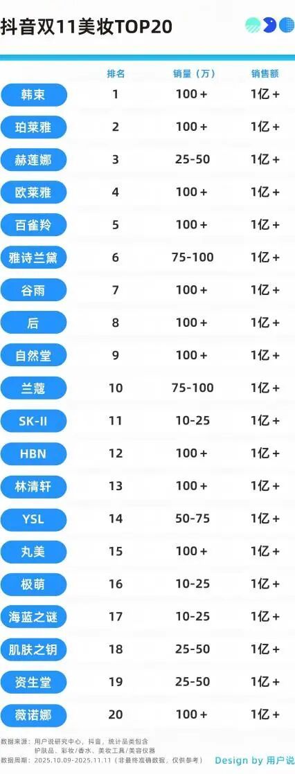 2025年双11的美妆赛道上,珀莱雅与韩束形成了“双雄争霸”的格局——珀莱雅蝉联天猫美妆三连冠,巩固中高端市场地位;韩束则登上抖音美妆头把交椅,延续平销期的领先势能。尽管两者的核心发力平台不同,但都遵循了“产品创新为核、品牌深耕为翼”的逻辑,成为国货美妆的两大标杆。